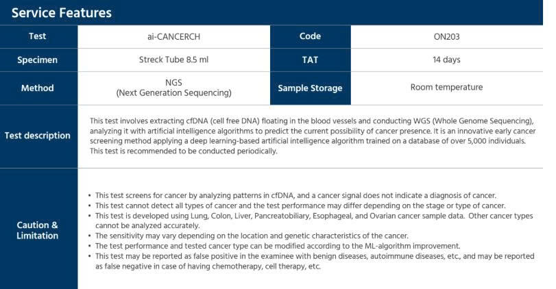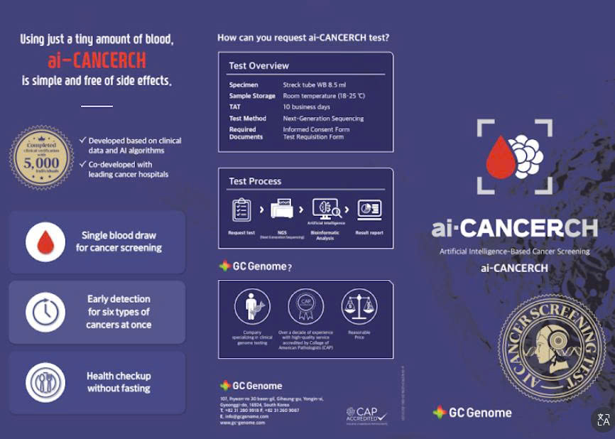 ai-CANCERCH là xét nghiệm phát hiện sớm đa ung thư (Multi-Cancer Early Detection – MCED) ứng dụng trí tuệ nhân tạo (AI) kết hợp sinh thiết lỏng từ máu. Xét nghiệm được phát triển bởi GC Genome Corp. và công bố trên tạp chí Nature Communications, mở ra hướng tiếp cận mới trong sàng lọc ung thư giai đoạn sớm.